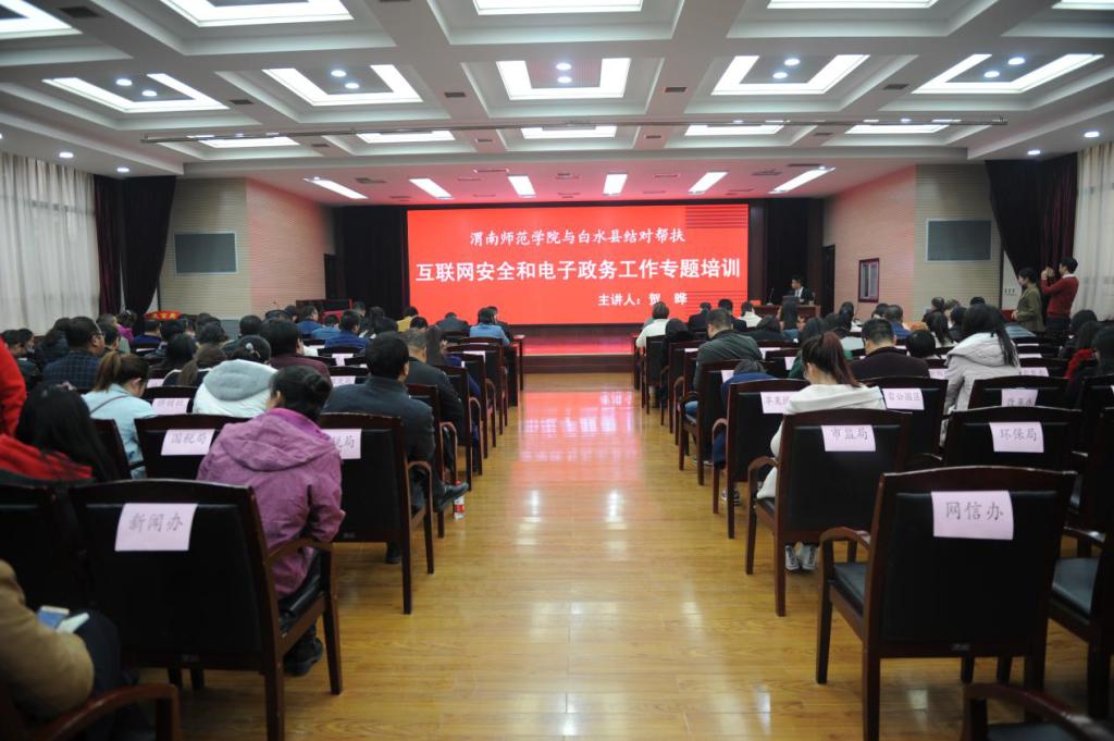 11月16日下午,在白水县政府多功能厅,我校与白水县结对帮扶开展信息化专题培训,白水县副县长胡小英、渭南师范学院bet5365最新线路检测副主任何泰伯、渭南市委网信办总工程师郑增康等参加了本次活动。全县各镇(办)、县级各部门的信息员、县委宣传部、网信办、政府法制办、公安局网安大队、文广局执法大队部分人员共计150余人参加了培训。培训由县政府副县长胡小英主持。